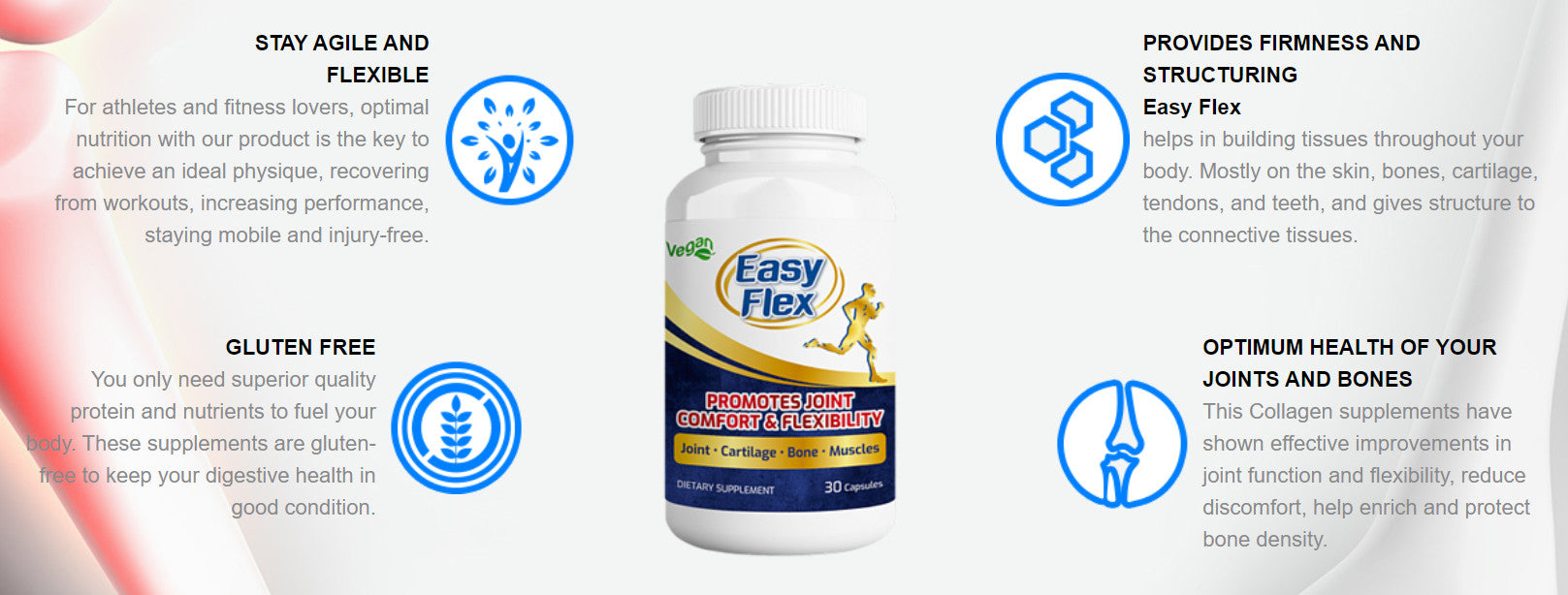 क्या आप जोड़ों के दर्द, कठोरता और सूजन से परेशान हैं? Easy Flex Capsules & Oil 100% हर्बल फॉर्मूले के साथ बनाया गया है, जो तुरंत और लंबे समय तक राहत प्रदान करता है। यह गठिया, जोड़ों की सूजन, और मांसपेशियों में अकड़न को कम करने में मदद करता है। डॉक्टरों द्वारा अनुशंसित और वैज्ञानिक रूप से प्रमाणित, यह सप्लीमेंट आपके जोड़ों को मजबूत बनाने और दर्द से राहत देने का एक प्रभावी तरीका है!