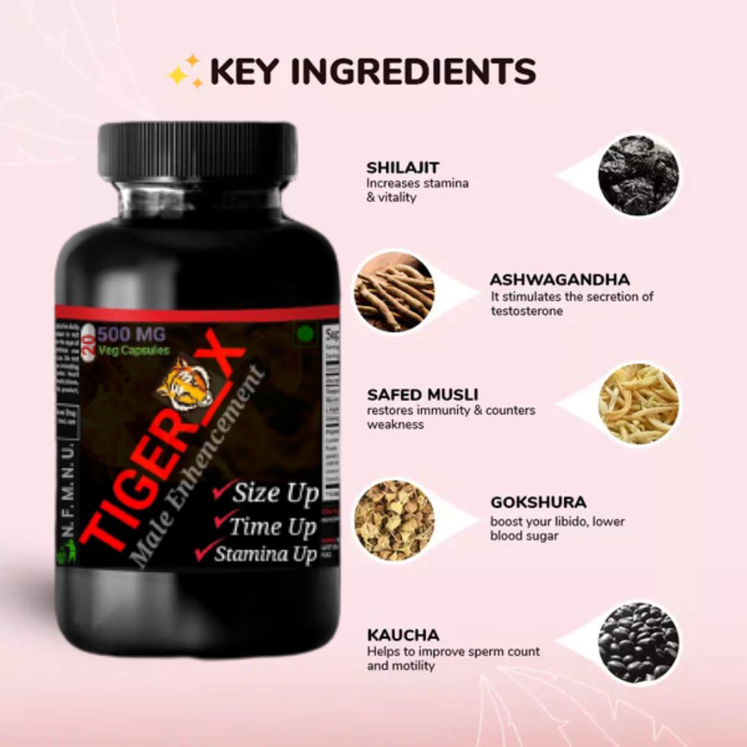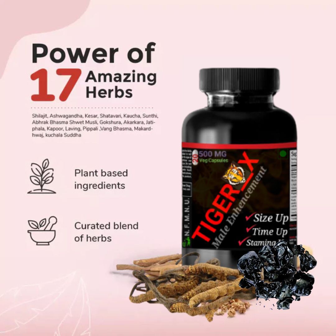 Tiger_X आपकी पूरी क्षमता को जागृत करने की कुंजी है। प्राचीन आयुर्वेदिक जड़ी-बूटियों जैसे अश्वगंधा, शिलाजीत और सफेद मूसली से भरपूर, Tiger_X नैचुरली आपकी स्टैमिना, ऊर्जा और आत्मविश्वास को बढ़ाता है — ताकि आप अपनी अंतरंग जिंदगी की बागडोर अपने हाथ में लें और उस जोशीले पार्टनर बनें जिसकी वो हमेशा से ख्वाहिश रखती है।