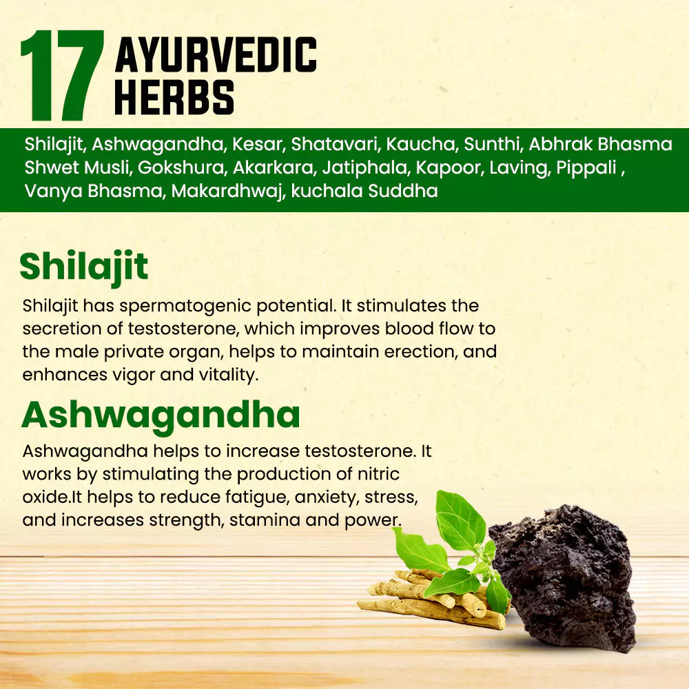 🌿 100% नेचुरल इंग्रीडिएंट्स – अश्वगंधा, शिलाजीत और सफेद मूसली जैसे शक्तिशाली आयुर्वेदिक तत्वों से भरपूर।